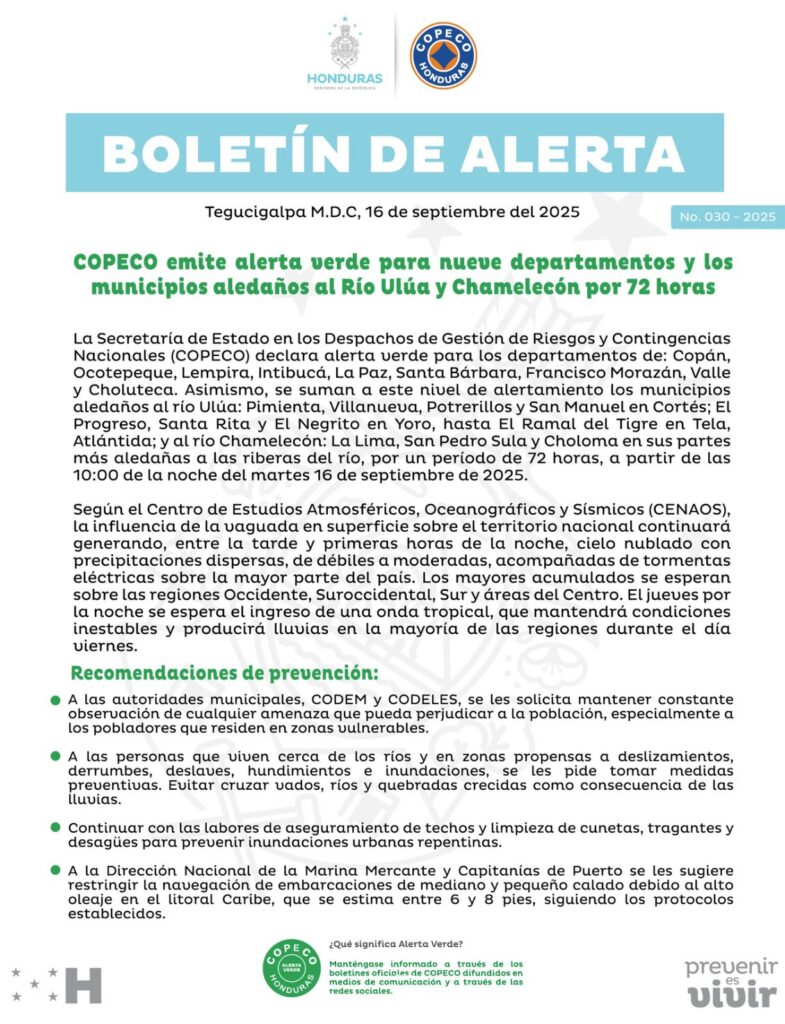 La Secretaría de Gestión de Riesgos y Contingencias (Copeco) declaró Alerta Verde en nueve departamentos del país y en varios municipios ubicados en las riberas de los ríos Ulúa y Chamelecón.