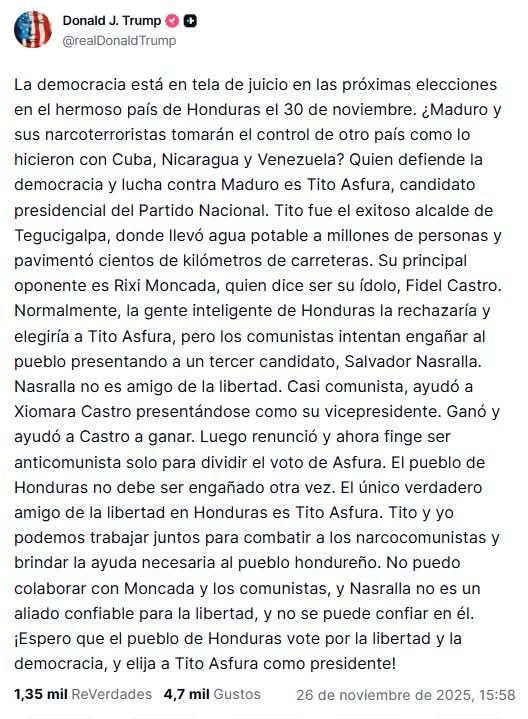 馃嚭馃嚫 El presidente de Estados Unidos, Donald Trump, se pronunci贸 en su red social Truth Social, en torno al proceso electoral del 30 de noviembre en Honduras y mostr贸 su postura pidiendo elegir a Nasry Asfura como presidente.